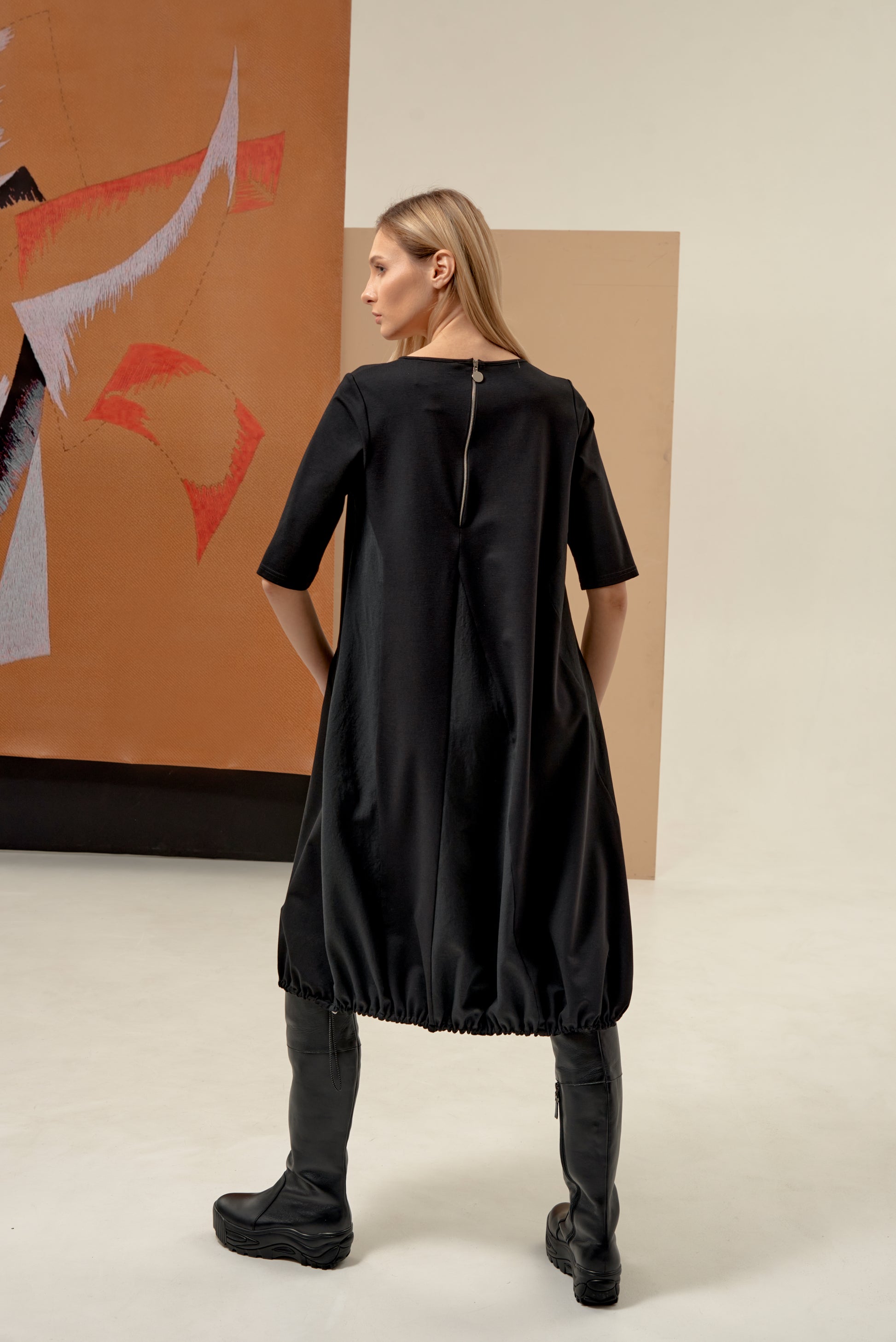 This elegant 3/4 sleeve dress features a refined balloon hem crafted from luxurious Japanese fabric, offering a unique silhouette with a subtle v-neckline. Designed with practicality in mind, it includes discreet pockets and an adjustable hem for a personalized fit. The back zipper closure ensures ease of wear, while the exclusive beige fabric detail adds a touch of sophistication and understated charm. A perfect blend of style and functionality for the modern wardrobe.